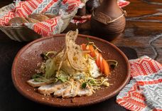 250 г • филе птицы, микс салата, помидор свежий, соус пикантный, чипсы хлебные, сыр, орех