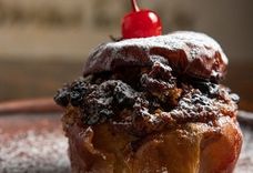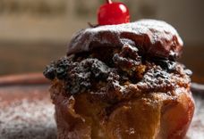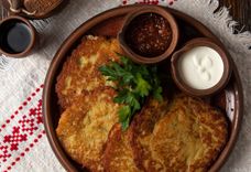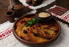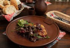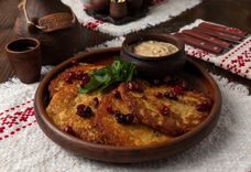 170/120/5 г • кусочки вырезки говяжей, тушеные в соусе вишневом с вином и огуречным рассолом, деруны картофельные, зелень
