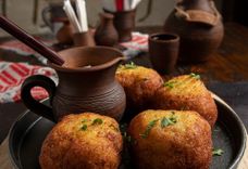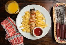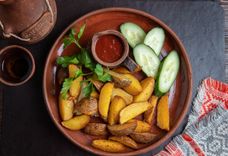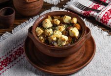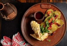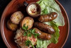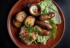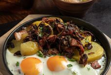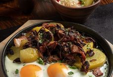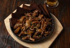 300/80/2 г • картофель отварной, жареные шампиньоны, бекон копченый, лук, яйцо жареное, маринованная капуста, зелень