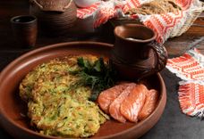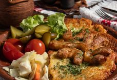 320/132 г • вырезка свиная, картофельные драники, помидоры марин., салат зеленый, маслины, огурцы марин.