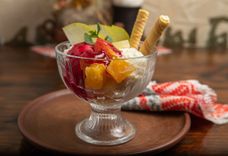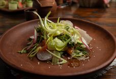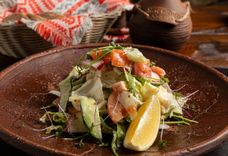220/20 г • сёмга с/с, редиска, огурец свежий, сельдерей, помидор свежий, зеленый салат, соус медово-горчичный, долька лимона