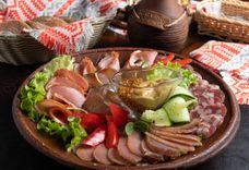 240/130/12 г • полендвица солёно-вяленая, птица вяленая, колбаса деревенская вяленая, копченый балык, хрен, горчица, огурец, перец сладкий, зелень