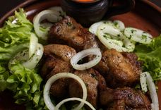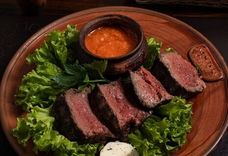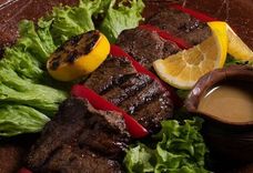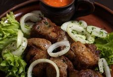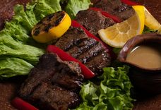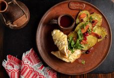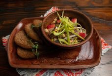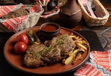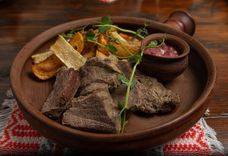 180/250/60/70/2 г • вырезка из говядины, картофель, сельдерей, огурцы соленые,соус брусничный, зелень