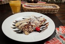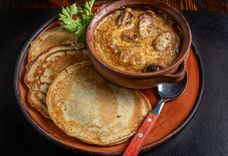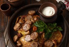 400/240/2 г • блины, свиное рёбрышко, лук, грудинка к/в, колбаса по-деревенски, грибы белые, зелень