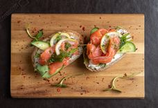 140 г • хлеб, сыр сливочно-творожный, семга с/с, огурец свежий, соус с зеленью, руккола