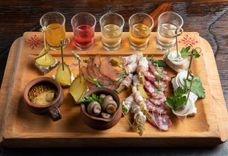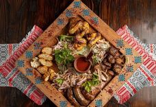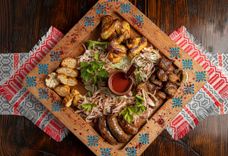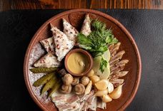 200/50/150/2 г • грудинка по-крестьянски, сало соленое, шпик по-домашнему, хлеб ржаной, горчица, лук, грибочки маринованные, соленый огурец, зелень