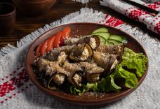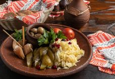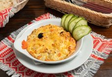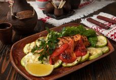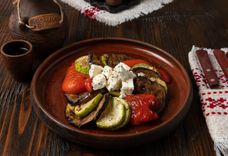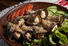 220/70 г • баклажаны, чеснок, сыр, орех грецкий, майонез, помидор свежий, огурец свежий, зелень.