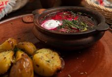 250/50/150 г • свекла, яйцо, свежий огурец, порей, сметана, жареный картофель дольками с розмарином