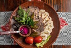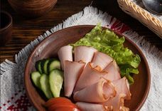 250/60/30/2 г • солёные огурцы, лук репчатый, томат, брусника, язык отварной, птица отварная, ветчина, сметана, зелень