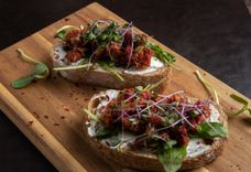 140 г • хлеб, вяленые томаты,сыр сливочно- творожный, соус с зеленью, руккола