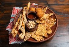 40/40/100/80/50 г • сырные шарики, острый лаваш с сыром, соленый арахис, острые слоёные палочки, соус садкий чили